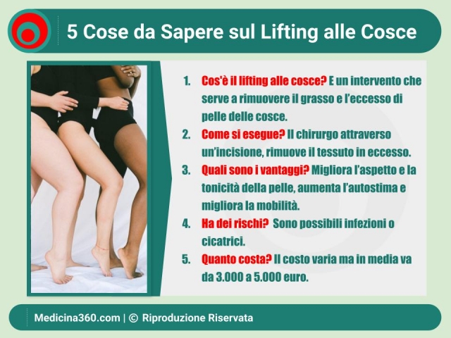 - Come funziona? La procedura di lifting delle cosce inizia con un'incisione nella zona da trattare. Il chirurgo poi solleva la pelle, rimuove l'eccesso di grasso e tessuto cutaneo e successivamente sutura la pelle a nuova forma.