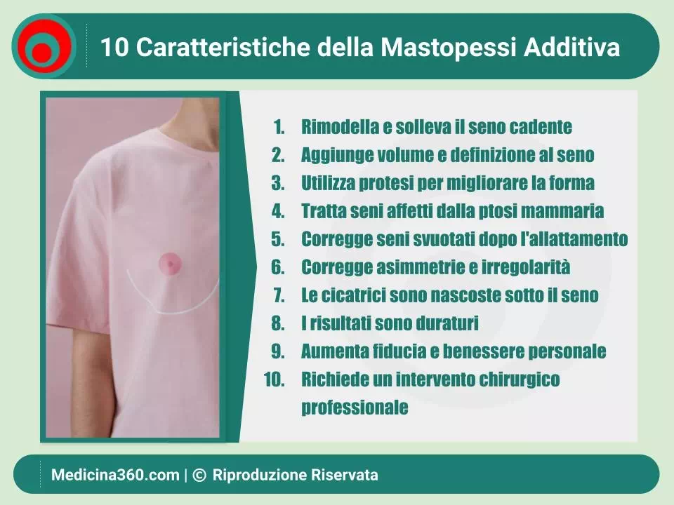 - Quali sono i rischi associati alla mastopessi additiva? Come per qualsiasi intervento chirurgico, la mastopessi additiva comporta alcuni rischi, tra cui infezioni, sanguinamento, cicatrici, reazioni avverse all'anestesia e complicanze legate all'impianto mammario.