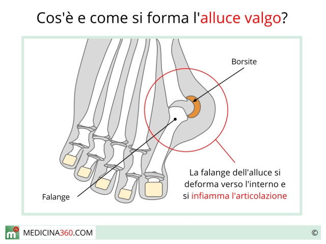 - L’alluce che si posiziona verso il lato interno del piede con la punta rivolta verso le altre dita, spesso si accompagna a borsite che è una sacca liquida e dolorosa che si forma alla base dell’alluce a causa della scorretta posizione. Le cause di questa patologia che comunemente viene definito “cipolla” o “patata” sono spesso dovute all’uso di scarpe poco adatte e poichè la moda femminile impone spesso scarpe scomode, le donne sono più soggette a tale deformità.