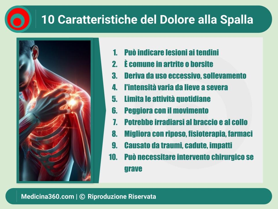 - Cosa può causare il dolore alla spalla? Il dolore alla spalla deriva da vari problemi, tra cui l'infiammazione dei tendini (tendinite), l'artrosi, la rottura dei tendini, o una dislocazione della spalla.