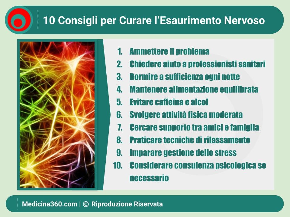 - Che cosa posso fare se penso di soffrire di esaurimento nervoso? Se pensi di soffrire di esaurimento nervoso, è importante consultare un professionista della salute mentale che è in grado di fare una diagnosi accurata e ti aiuta a elaborare un piano di trattamento. Non esitare a chiedere aiuto, l'esaurimento nervoso è una condizione seria che richiede cure mediche.