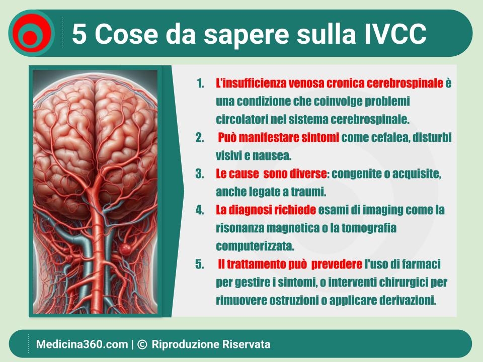 - Cos'è l'IVCC? L'Insufficienza Venosa Cronica Cerebrospinale è una condizione che riguarda la circolazione del sangue nel cervello e nel midollo spinale. È caratterizzata da un flusso sanguigno anormalmente lento o da un blocco dei vasi sanguigni.