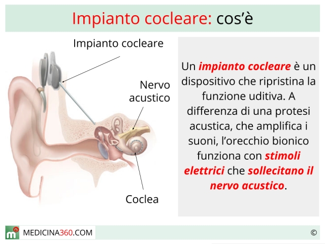 Un impianto cocleare è un dispositivo che sostituisce la normale funzione dell'orecchio e va considerato come un "orecchio elettronico" o "bionico" in quanto, una volta impiantato, ripristina la funzione uditiva.