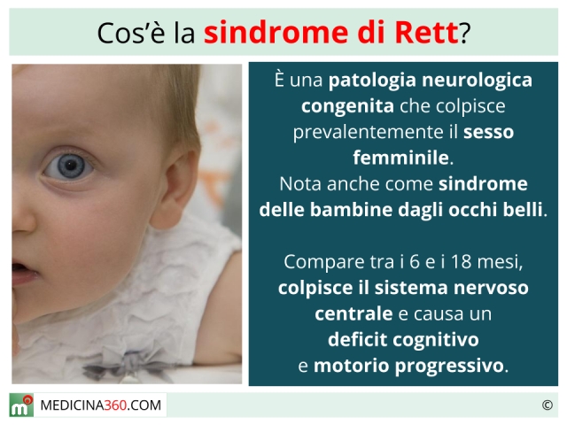 La sindrome di Rett è una patologia neurologica congenita, chiamata anche "sindrome delle bambine dagli occhi belli", che si manifesta durante l'età dello sviluppo e che colpisce prevalentemente soggetti di sesso femminile, sebbene siano stati osservati rari casi della sindrome nei maschi. Non si manifesta alla nascita ma tende a comparire tra i 6 e i 18 mesi di vita, colpisce il sistema nervoso centrale e causa un deficit cognitivo e motorio progressivo, con gravità variabile ma solitamente invalidante.