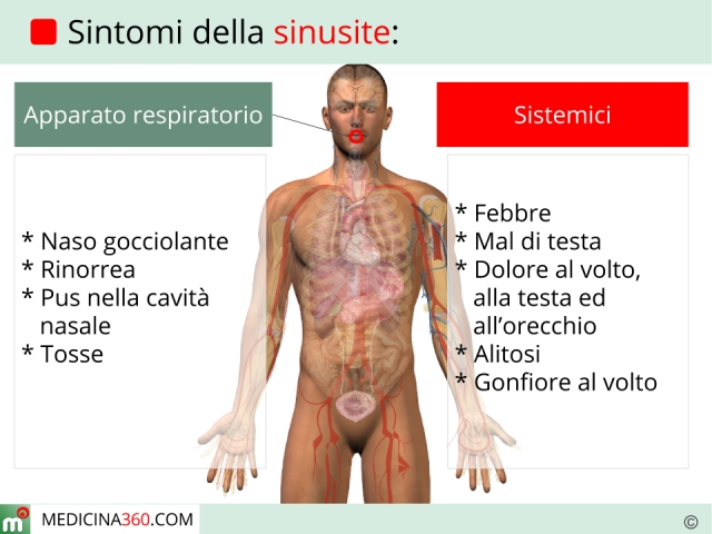 Quando i sintomi (raffreddamento o influenza come naso chiuso, emissione di muco, febbre e mal di testa) perdurano per più di 5 - 7 giorni, o se compare febbre dopo questo periodo, bisogna sospettare una sinusite.